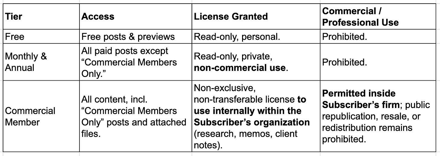 The Publisher retains full copyright and all intellectual-property rights in every post, chart, table, file, podcast, and graphic. Only the limited licenses above are granted.